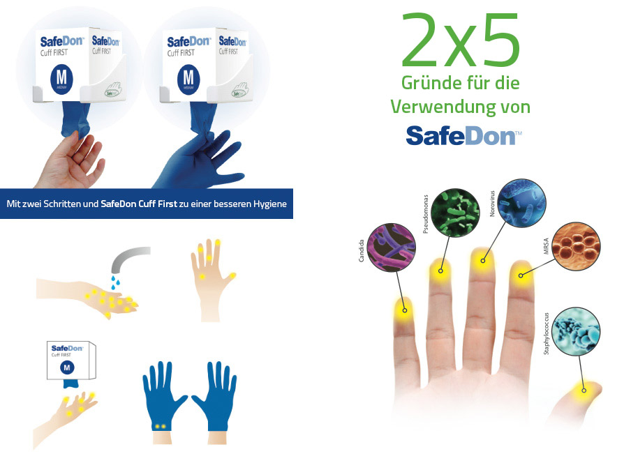 Das innovative Verpackungssystem des SafeDon™ Hygiene Systems ermöglicht die Entnahme eines einzelnen Handschuhes durch die „Manschette zuerst“ Technologie. Das SafeDon™ Hygiene System weist gegenüber der herkömmlichen Handschuh-Box zahlreiche Vorteile auf und führt zur Reduktion der Gefahr einer Kreuzkontamination.