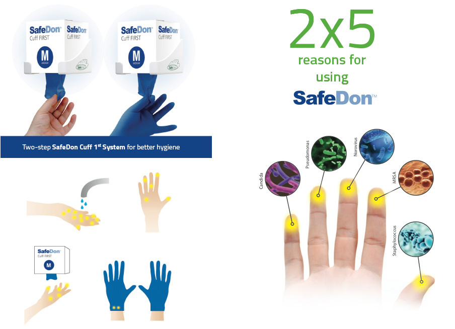 The new SafeDon™ Hygiene system dispenses the gloves individually Cuff 1st from the bottom of the box. By dispensing the gloves Cuff 1st compliance is automatically engineered into every glove box, thereby offering obvious benefits when compared to any other traditional examination glove dispensing system: